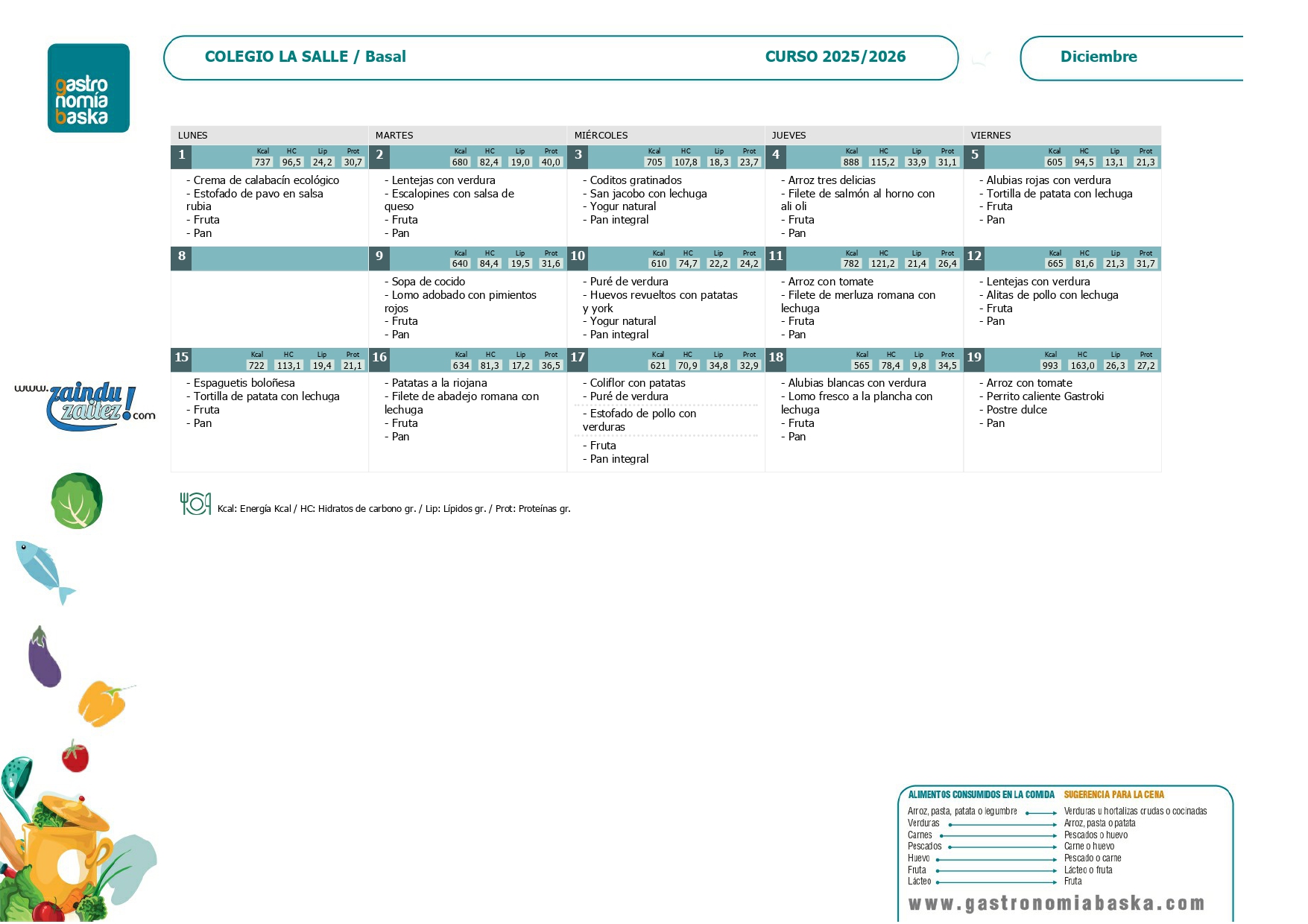 En caso de ausencia o necesidad de dieta blanda es necesario avisar mediante correo a bajas.altas.dietas@lasallebilbao.com o bien por teléfono. Os rogamos que dichas solicitudes las realicéis ANTES DE LAS 09.30 DE LA MAÑANA para que el servicio de comedor disponga del tiempo necesario para preparar dichos menús especiales.